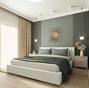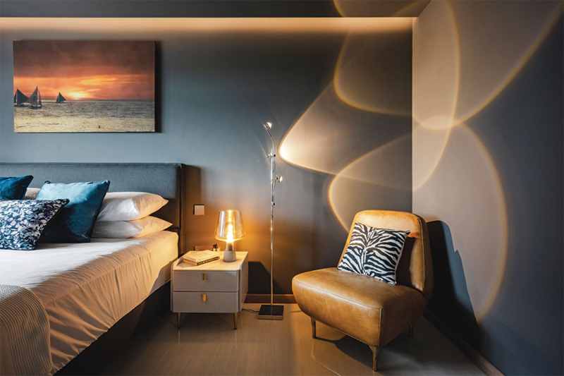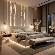 Акцентный свет – LED-лента за изголовьем, подсветка текстурных стен.